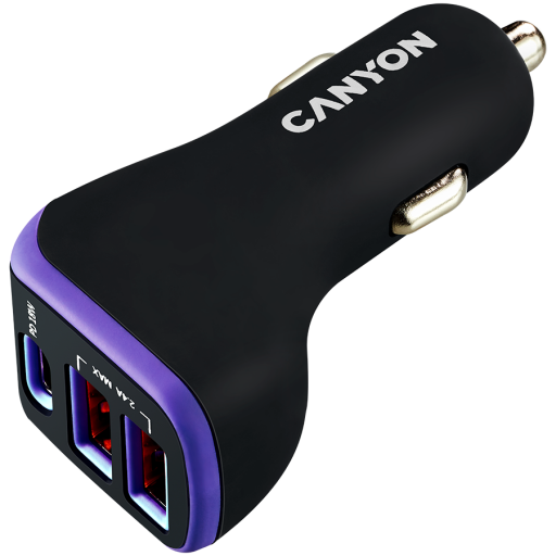 CANYON C-08, Universal 3xUSB car adapter, Input 12V-24V, Output DC USB-A 5V/2.4A(Max) + Type-C PD 18W, with Smart IC, Black+Purple with rubber coating, 71*39*26.2mm, 0.028kg | Brand: CANYON | Category: Car Accessories | Warranty: 24 months | EAN: 5291485006631 | Supplier Link: https://content.it4profit.com/itshop/itemcard_cs.jsp?ITEM=201130060533962759&THEME=asbis&LANG=en